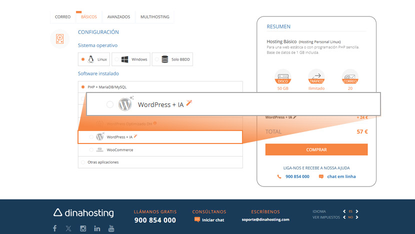 Elixe o plan de hosting que prefiras e selecciona WordPress + IA no configurador. Se xa tes un hosting, actívao dende Ampliacións e configúrao na sección de Autoinstalables. Despois, segue os pasos!